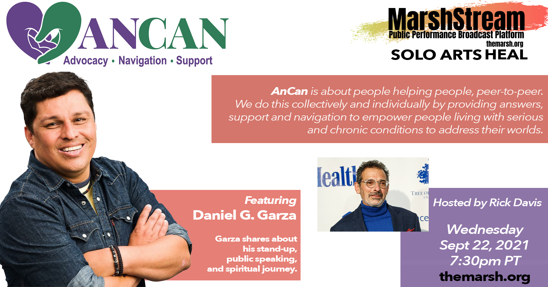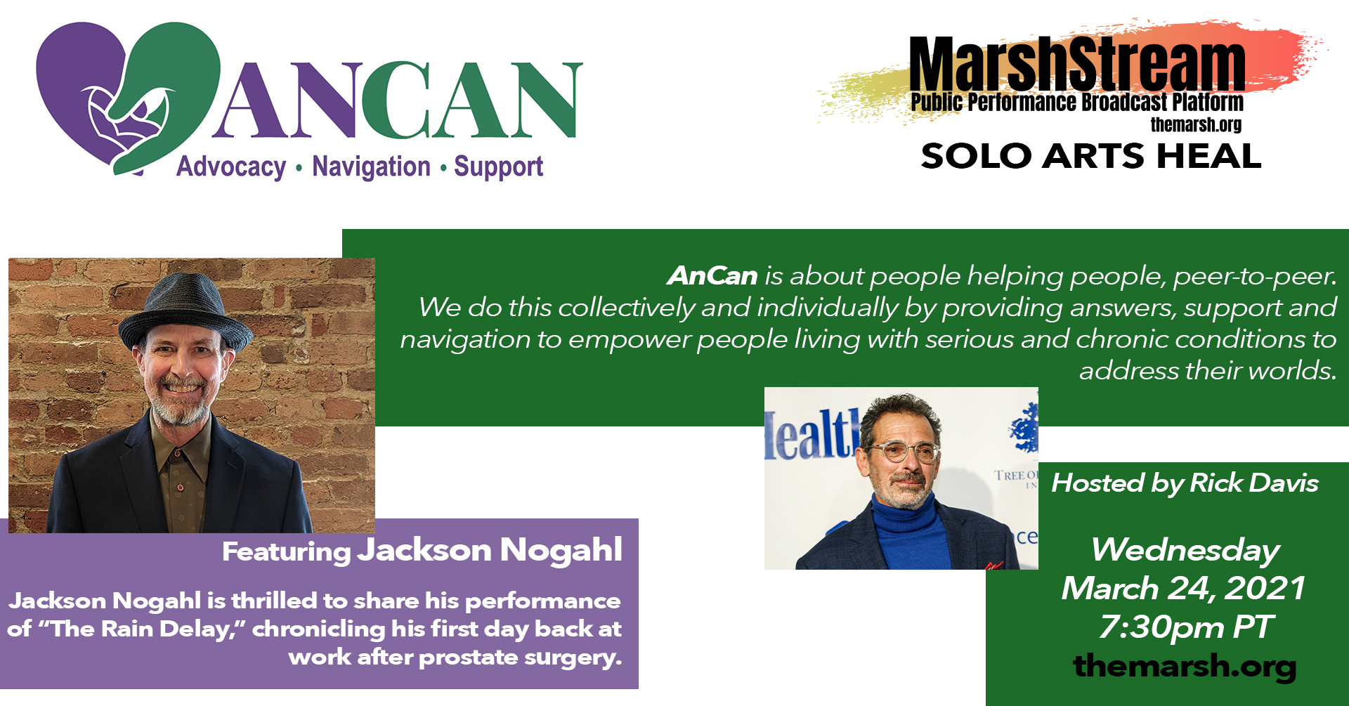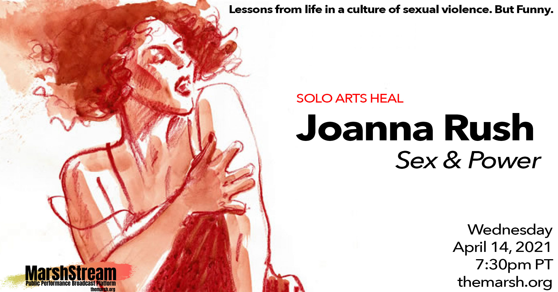 Solo performers present real-life, empowering stories. Transformative experiences for audiences. A theater of resilience that celebrates overcoming mental and physical life challenges and offers hope and inspiration. SOLO ARTS HEAL includes excerpts, talkbacks, and Q&A that provide education and advocacy. Readings or clips of performances will be shared by artists in conversation with Gail Schickele, whose work as a manager and producer of solo artists inspired collaboration of performing arts presenters with artists on a medical track based on their personal experience. The collective creative vision? To help communities through educational outreach and the healing power of the Arts.