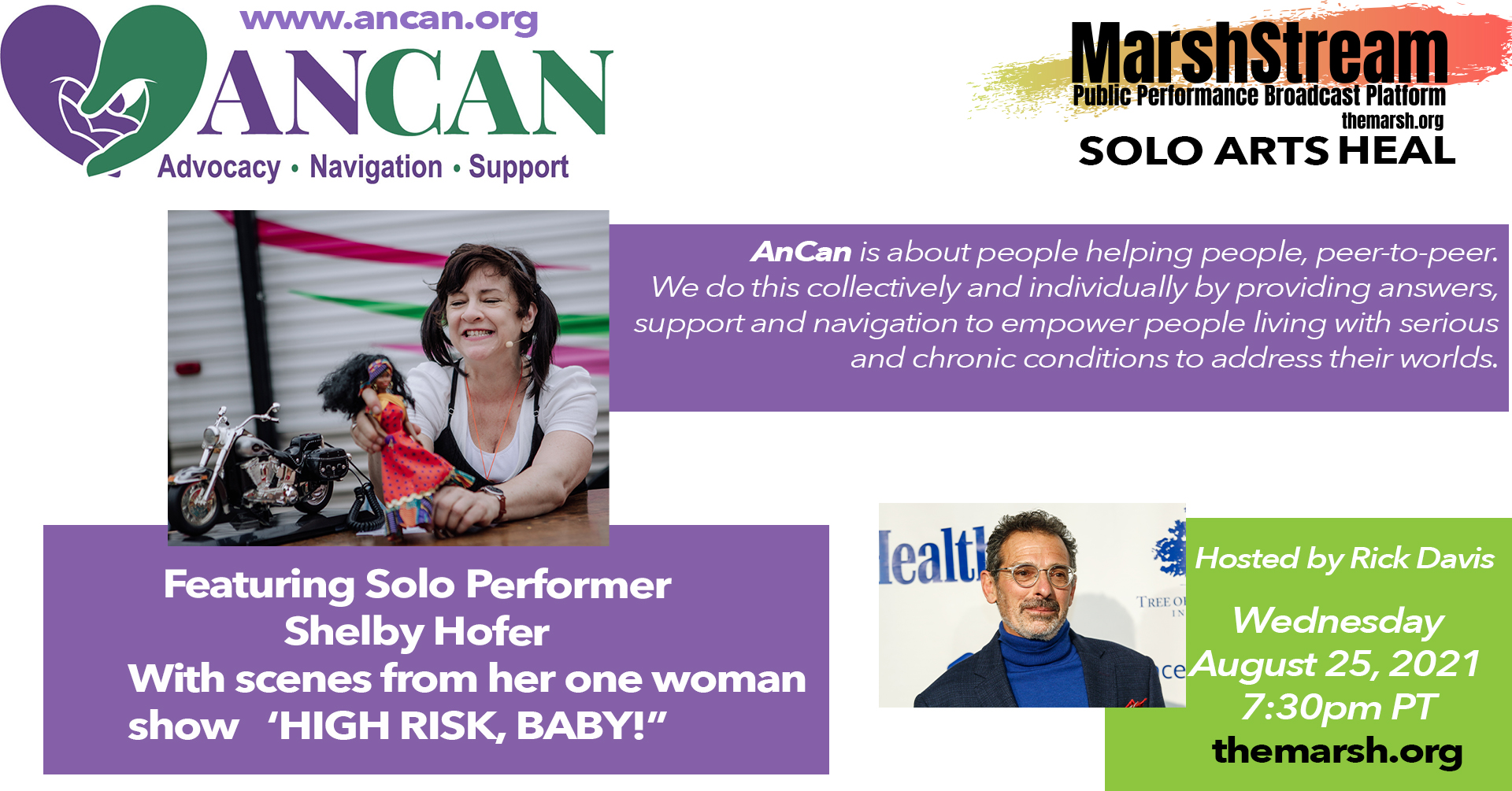 Gail Schickele (Host) champions arts & sciences taking her left and right brain wherever she travels. As an arts manager, consultant, and producer dba SAGE Artists, she convened an ‘Arts Heals’ group of solo artists at APAP 2020 whose unique stories of physical and mental challenges evince the healing power of The Arts. The COVID lockdown inspired Stephanie Weisman to create SOLO ARTS HEAL to share these outstanding stories of resilience, dramatic and comedic, for the entertainment and benefit of communities everywhere. Gail’s expertise in marketing, management, booking and production has served various theaters, festivals and events nationwide. Trained as a journalist in New York and Colorado, Gail has covered Colorado state politics and the environmental landscape of the Rockies. Environmental science inspires her educational and advocacy work in California with Al Gore’s Climate Reality Project, and for the League of Women Voters for which she’s worked as an administrator and reporter on environmental issues Including legislation, climate science outreach, and co-chair of an environmental speakers series. Gail is honored to host SOLO ARTS HEAL where artists powerful stories offer audiences great performance and ‘informance’ on issues related to health and the environment, inexorably linked.